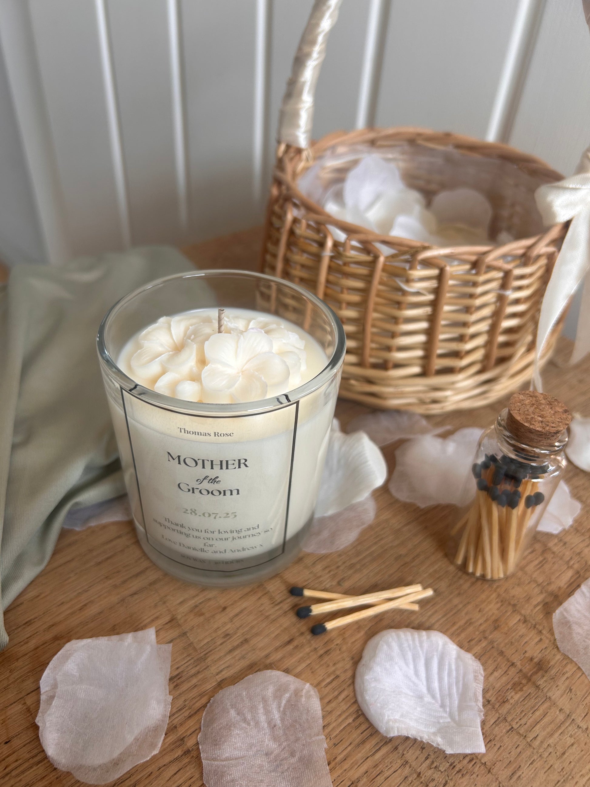 Whether you're looking for a Mother of the Groom thank you gift, a custom bridal party candle, or a handmade wedding keepsake, this charming candle is the perfect blend of beauty, fragrance, and sentiment.